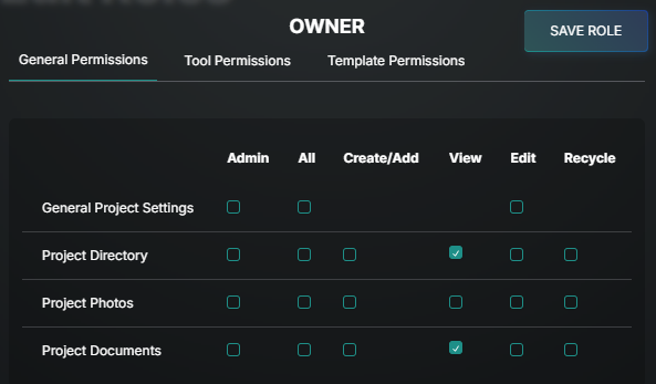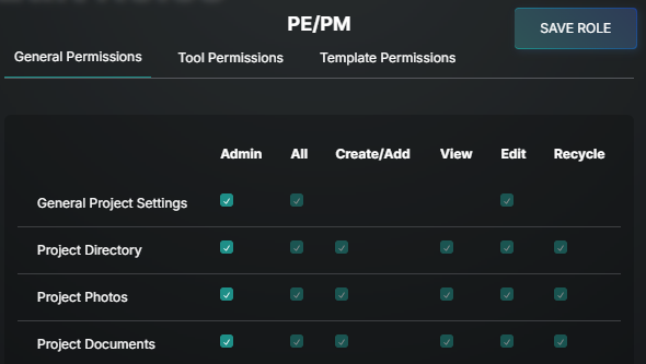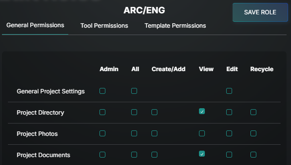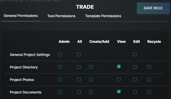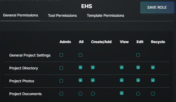 Create New Project Level Role: From the Directory, go to the Roles tab and select ADD role. If the role you are creating is similar to an existing company role, use the Duplicate option in the upper left for a starting point and make changes from there.