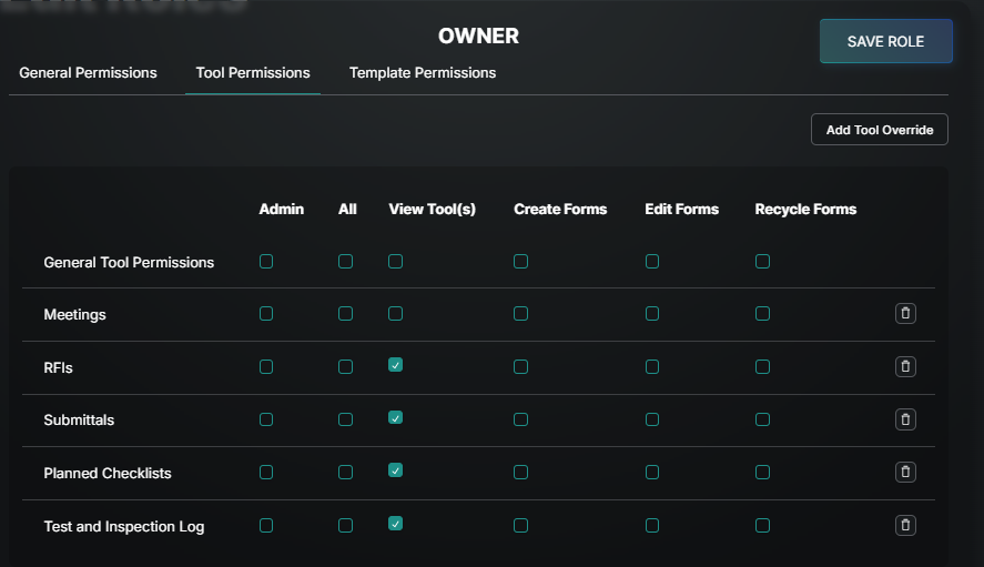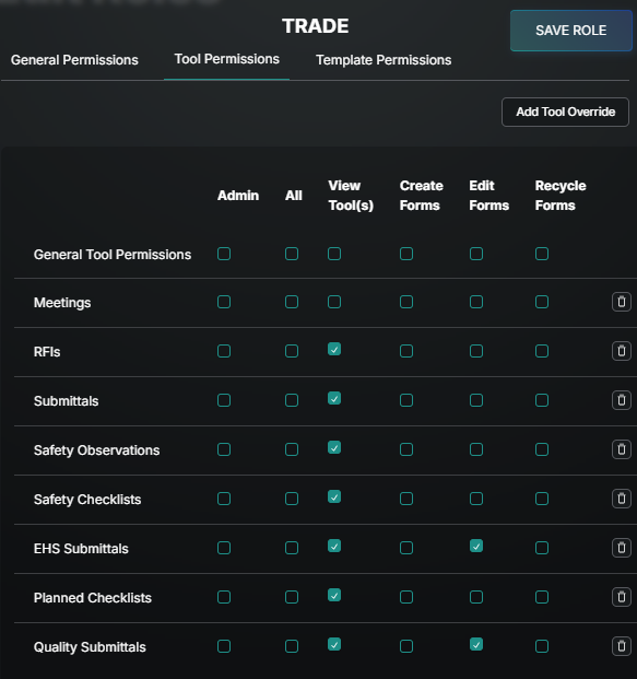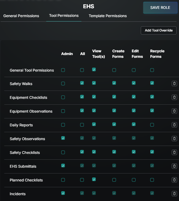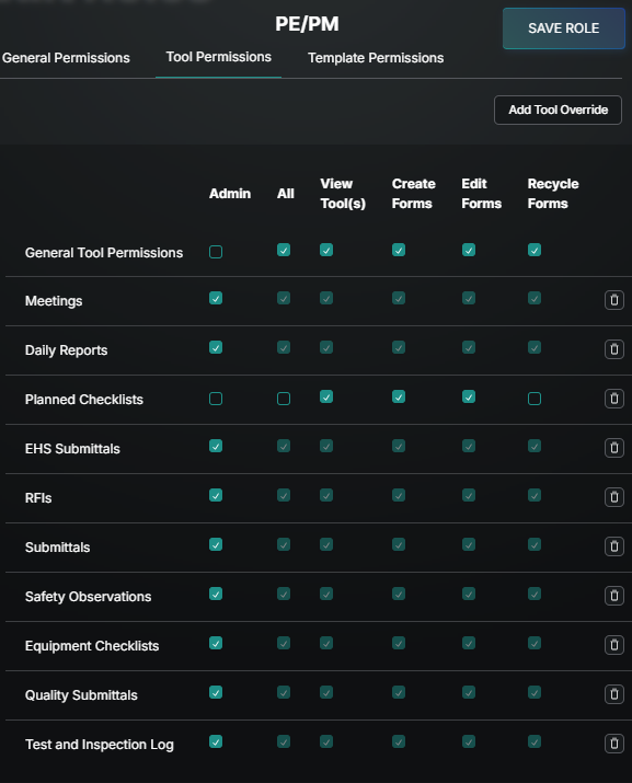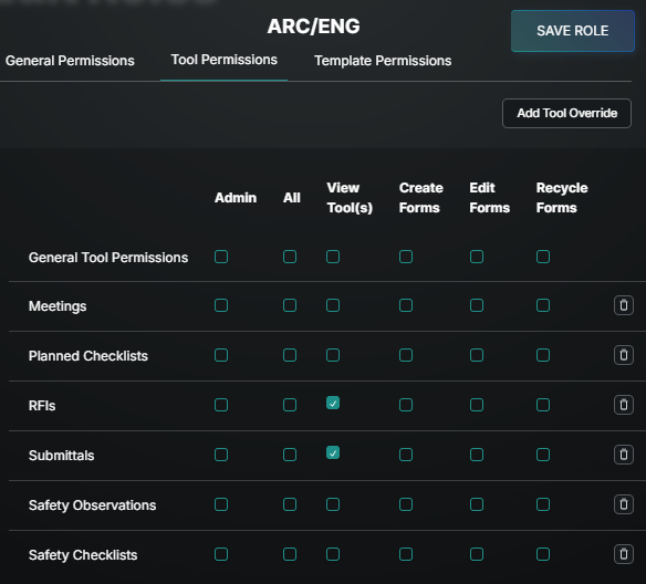 Start with General tool permissions, choose which options to include by checking the box, and then add granularity with Overrides on the Tools and Templates. These Overrides add or remove permission based on what is selected on the General line.