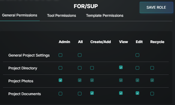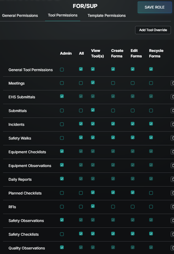 In the example video below the For/Sup role will has all access except Admin on all tools except for the ones listed there is all access plus admin. If a tool were too be added with no boxes checked it would remove that tool from the menu all together.